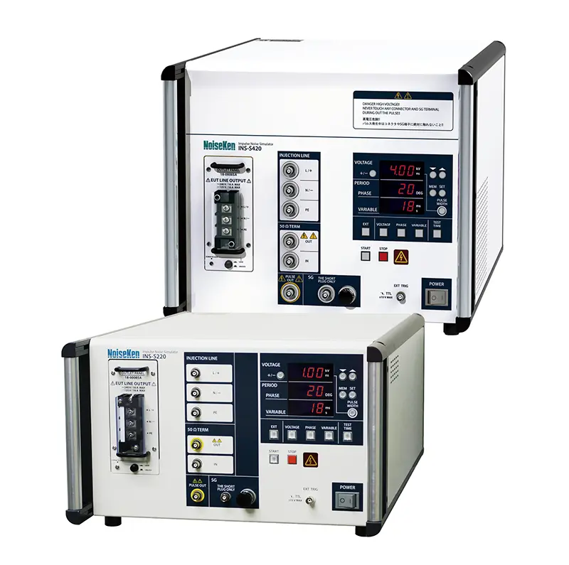 This Noise simulator simulates high frequency noises generated by ON/OFF switching at contact points of switches or relays, and arcs caused by electric motor, allowing to evaluate the resistibility of electric devices.
