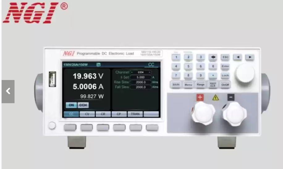 N6200 series is a programmable DC electronic load with high accuracy, high reliability and high cost performance. It supports local control via screen&button and remote control on PC. It is with built-in LAN port and RS232 interface. N6200 series is designed in a 19 inch 2U chassis, which is available for benchtop use or installation in 19 inch rack.