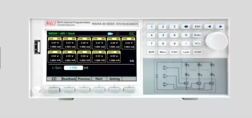 N9244 series is a constant current programmable power supply with multi-channel, high integration, high performance, a standard ½ 19 inch 2U chassis with 44 channels constant-current source output. It supports both desktop and system applications. N9244 series voltage specification is 40V, support constant current 5mA output, no leakage current under OFF state. NGI provides standard upper computer software to support large-scale testing and LAN/RS232 communication control. Users can carry out secondary development according to testing process and testing requirements, which is convenient for integrated system testing.