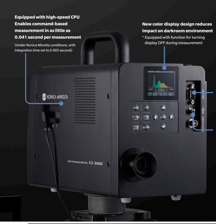 The Spectroradiometer CS-3000 series comprises three models: the Spectroradiometer CS-3000HDR, the Spectroradiometer CS-3000, and the Spectroradiometer CS-2000Plus. These spectroradiometers, known for their high precision and speed, offer automation features and various innovative functions such as Intelligent Dark function and emission frequency detection/setting, enabling them to measure a wide variety of display types, including high dynamic range (HDR) displays, and light sources with exceptional accuracy and reliability.